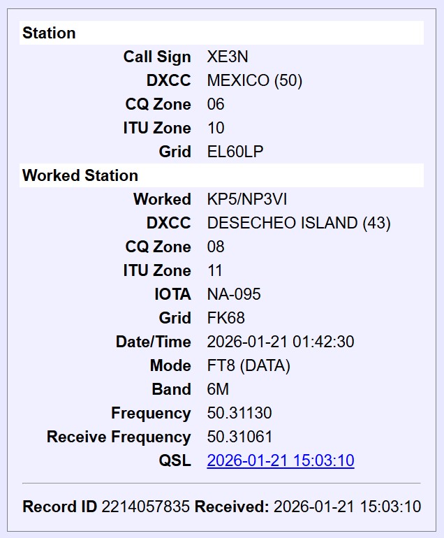 Este fue el primer contacto entre la Isla Desecheo y México en la banda de 50 mhz lo que lo convirtió en PRIMERA VEZ o “XE-First”.