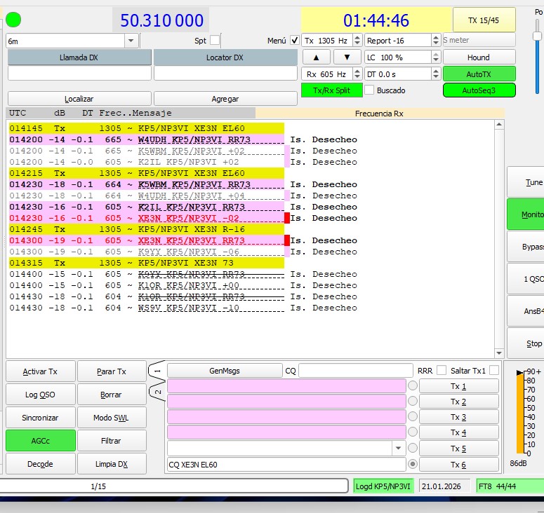 Lo que me empezó a darme una idea de las buenas condiciones de propagación, fue que a pesar de la hora empecé a recibir estaciones del este de Africa, Islas Canarias concretamente, con buena señal y pude corroborar que al menos tres estaciones me estaban recibiendo, por lo que procedí a subir al clúster de DX un llamado a la expedición KP5/NP3VI en la Isla Desecheo en territorio de Puerto Rico para que hicieran lo posible por salir a la banda pues todo parecía indicar que habría una gran apertura (así lo manifesté en el clúster) porque parecía se venía algo muy atípico y pintaba bastante bien para los amantes de la banda mágica. Y bingo, comenzó la fiesta, la estación KP5/NP3VI salió a la banda y eso atrajo a muchísimas estaciones, de no creerse el “pileup” o apilamiento que se formo, parecía banda de 20m con una entidad rarísima, nunca había visto llamar a tantas estaciones en la banda de 6m fue maravilloso que le dedicarán tiempo a esta banda tan caprichosa y la espera había rendido frutos, empecé a recibir a la estación de la expedición DX, tan solo dos llamados y gran emoción: me contestaba y lograba el contacto.